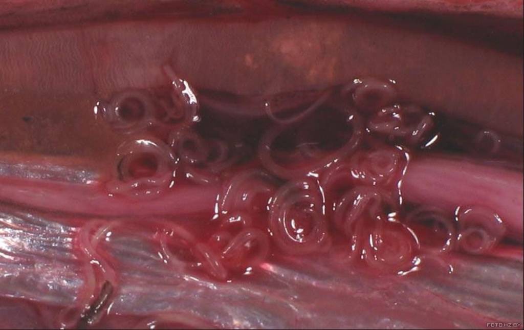 С током крови личинки и взрослые особи могут попадать в сердце, это крайне опасно, так как возможен летальный исход. Паразиты ухудшают проходимость сосудов, при этом развивается ишемия, питание сердца становится недостаточным, и работа органа нарушается.