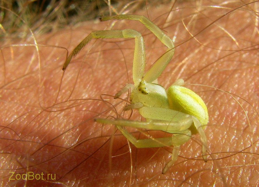 Потом выявился интересный способ «занять» гостя, чтоб успеть-таки поднести к нему объектив. Подспорьем в этом деле стала моя волосатая рука: желтый паук путался в волосах, подолгу соображал, куда перекинуть свои длинные ноги, так что его фотогеничность заметно повысилась.
