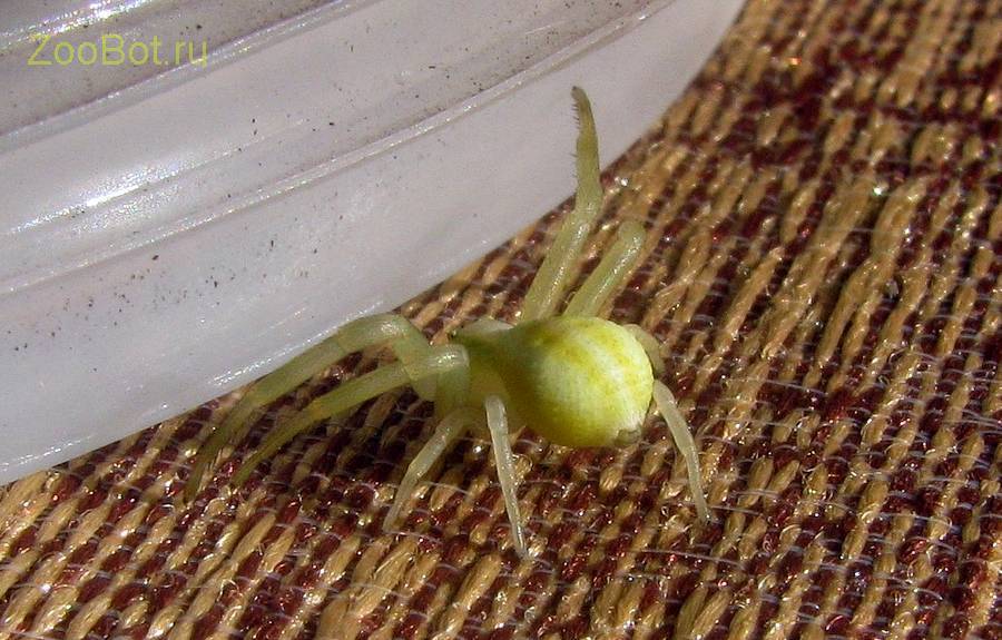 Этого симпатичного представителя паукообразных я проидентифицировал как цветочного паука вида Misumena vatia из семейства пауков-бокоходов (пауков-крабов).Несколько смущает тот факт, что в моем присутствии паучок двигался исключительно прямолинейно и никаких крабьих замашек не проявлял, но яркая окраска и форма тела, все-таки, говорят за то, что это паук-бокоход. Обнаружился желтый паук отнюдь не на цветке, хоть название у него и цветочное, а на грибе. Желтый паук оказался прытким, и, будучи выпущен из банки, пустился в гонку по просторам стола, в связи с чем сфотографировать его оказалось достаточно непросто.