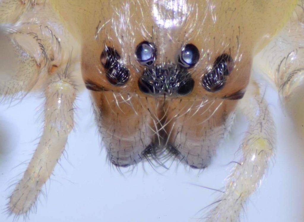 При виде паука сака, бросается внимание на мощные челюсти заостренной формы, закругленные по краям. Этим колющим оружие паук разрывает панцирь жертвы (хитиновый покров), а после впрыскивает свой яд