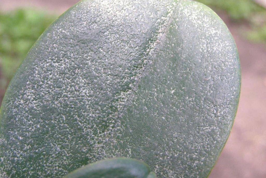 - мелкие вдавленные серые вкрапления на зеленой части листьев;