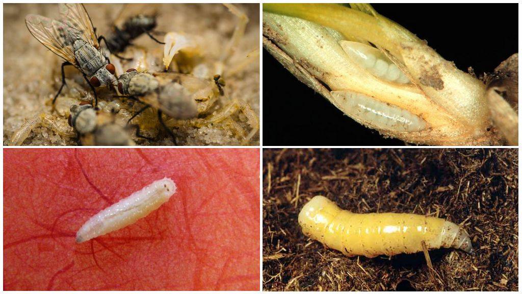 На следующем фото можно видеть цикл превращения мухи из личинки во взрослую особь: яйцо, личинка, куколка, взрослая комнатная муха.