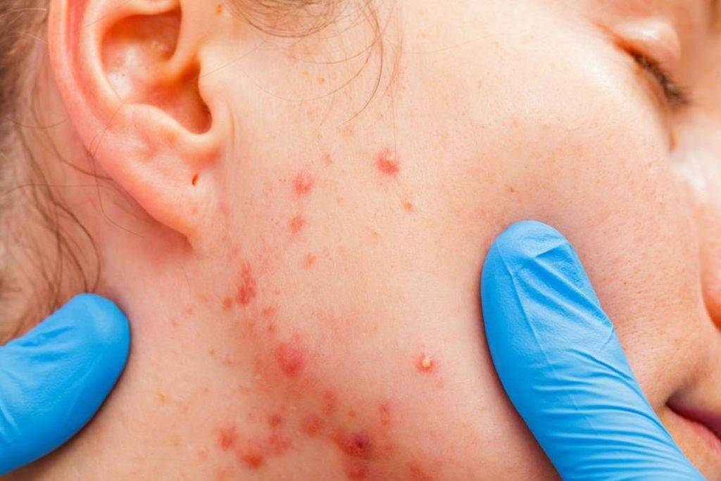 - Высыпания на лице: на первичном этапе развития заболевания, гиперемированная кожа покрывается розовыми папулами, постепенно развивающимися в пустулы, гнойнички и прыщи;