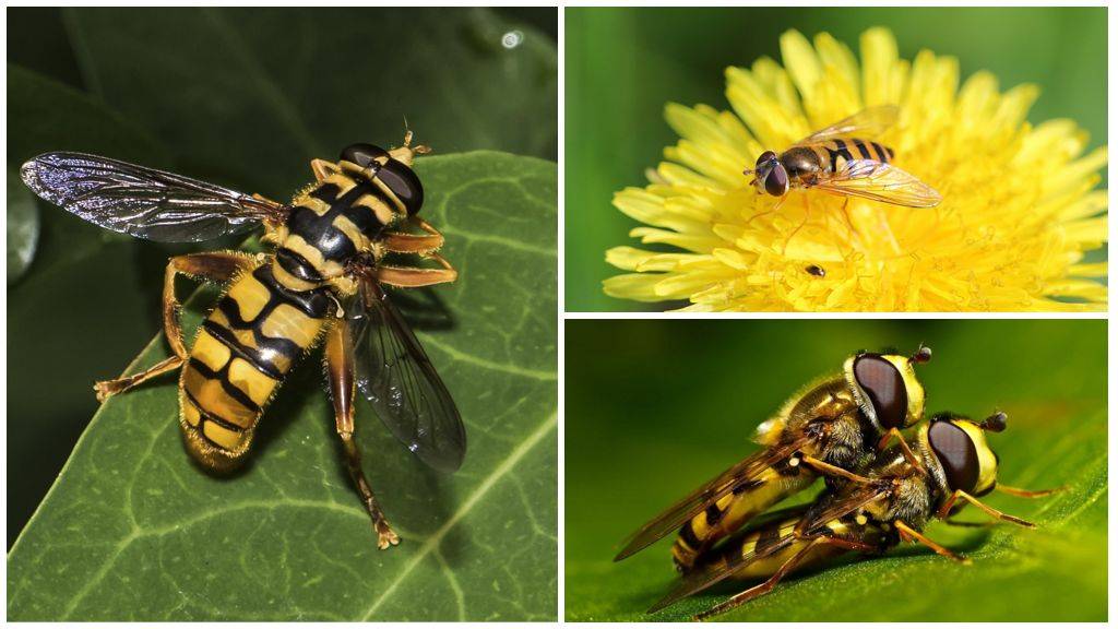 Однако не все мухи являются вредителями. Мухи-журчалки очень напоминают ос – как по внешним признакам, так по особенностям поведения. В летний период чаще всего их можно увидеть около сложноцветных или зонтичных растений. Тело насекомого покрыто черными и желтыми полосами, а на полукруглой голове расположены большие глаза темно-коричневого цвета. Рацион взрослых особей составляет цветочный нектар.