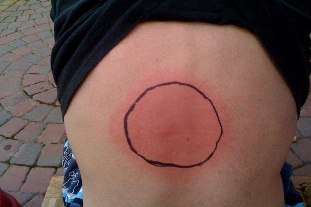 - Патогномоничный симптом, по которому диагностируется это заболевание – появление кольцевидной эритемы (местного покраснения). Наличие этого признака является достаточным основанием для постановки диагноза. Пятнышки появляются на неизменном фоне кожи, не наблюдается зуд после укуса, не выступают над поверхностью тела. По размеру – могут быть самими разными, начиная от 5-копеечной монеты и заканчивая 10-15 см в диаметре.