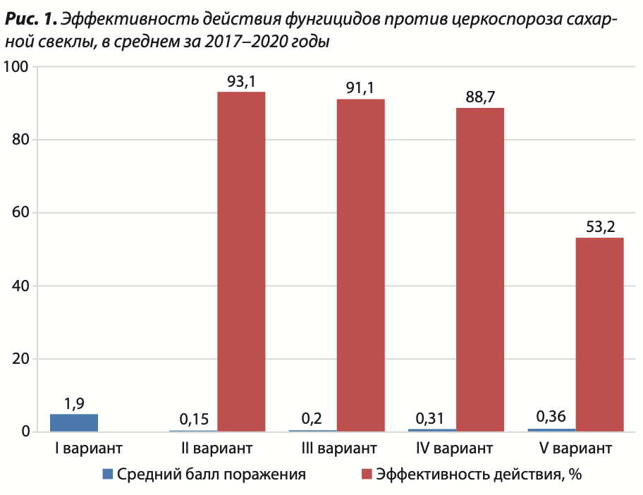 Действенность фунгицидов устанавливалась по общепринятой методике в течение 2017–2020 годов на темно-серой подзолистой среднесуглинистой почве опытного поля научного учреждения. Содержание гумуса в пахотном слое 0–30 см составляло 2–2,5%, реакция почвенного раствора была слабокислой — 5,5–6,5, гидролитическая кислотность равнялась 2–4,2 мг-экв/100 г почвы. Степень насыщения основаниями достигала 75–90%, уровень азота по Корнфильду — 51,2 мг/кг, Р2О5 по Чирикову — 92 мг/кг, К2О по Масловой — 107 мг/кг. В опыте использовался районированный в условиях лесостепи Украины гибрид сахарной свеклы Злука.
