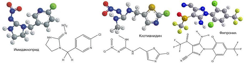 - Клотианидин – в препаратах Борей Нео, Бусидо, Восторг, Гладиатор Супер, Жукоед, Каратель, Клотианидин Про, Клотиамет, Пиноцид и др.