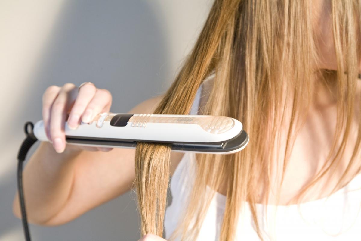 - Утюжок или плойка для укладки волос. Для этого следует нагреть устройство до максимальной температуры и обработать каждую прядь волос. Обрабатывать каждую прядь следует не менее 2–3 минут.