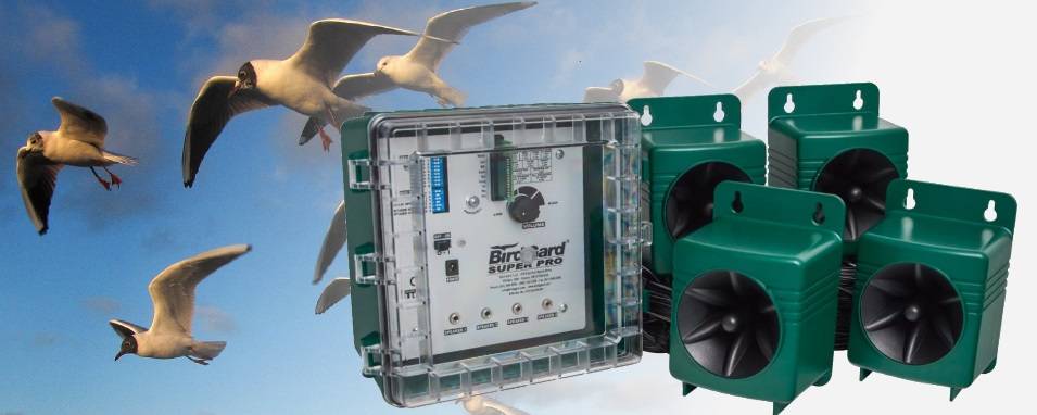 Bird Gard Pro Plus — биоакустический отпугиватель птиц американского производства, предназначен для промышленных отраслей. Для проигрывания звуков в комплект входят два выносных звукоизлучателя. Есть возможность сохранить в памяти до 8 записей.
