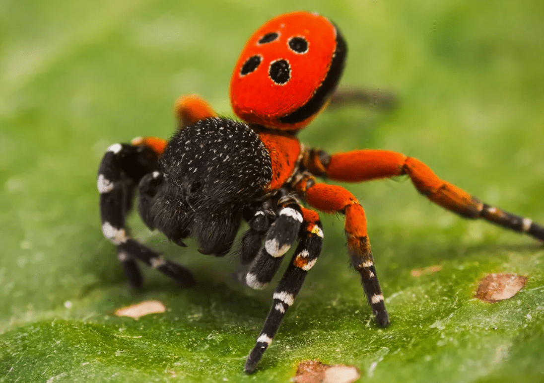 Этого паука еще называют «божья коровка». Название обусловлено внешним видом паука, но эффектно выглядит только самец. На его тельце пятнышки, самки – бархатисто-черные, а самцы имеют оранжево-красное брюшко с 4 черными пятнышками.
