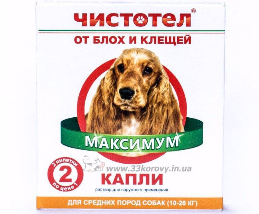 «Чистотел». Использовать рассматриваемое средство можно только после 2-месячного возраста питомца. Работает против блох и клещей и может защищать животное 2 месяца от первых и 1 месяц от вторых. Очень важно в течение первых 48 часов нельзя позволять детям приближаться к собаке, а также купать животное.