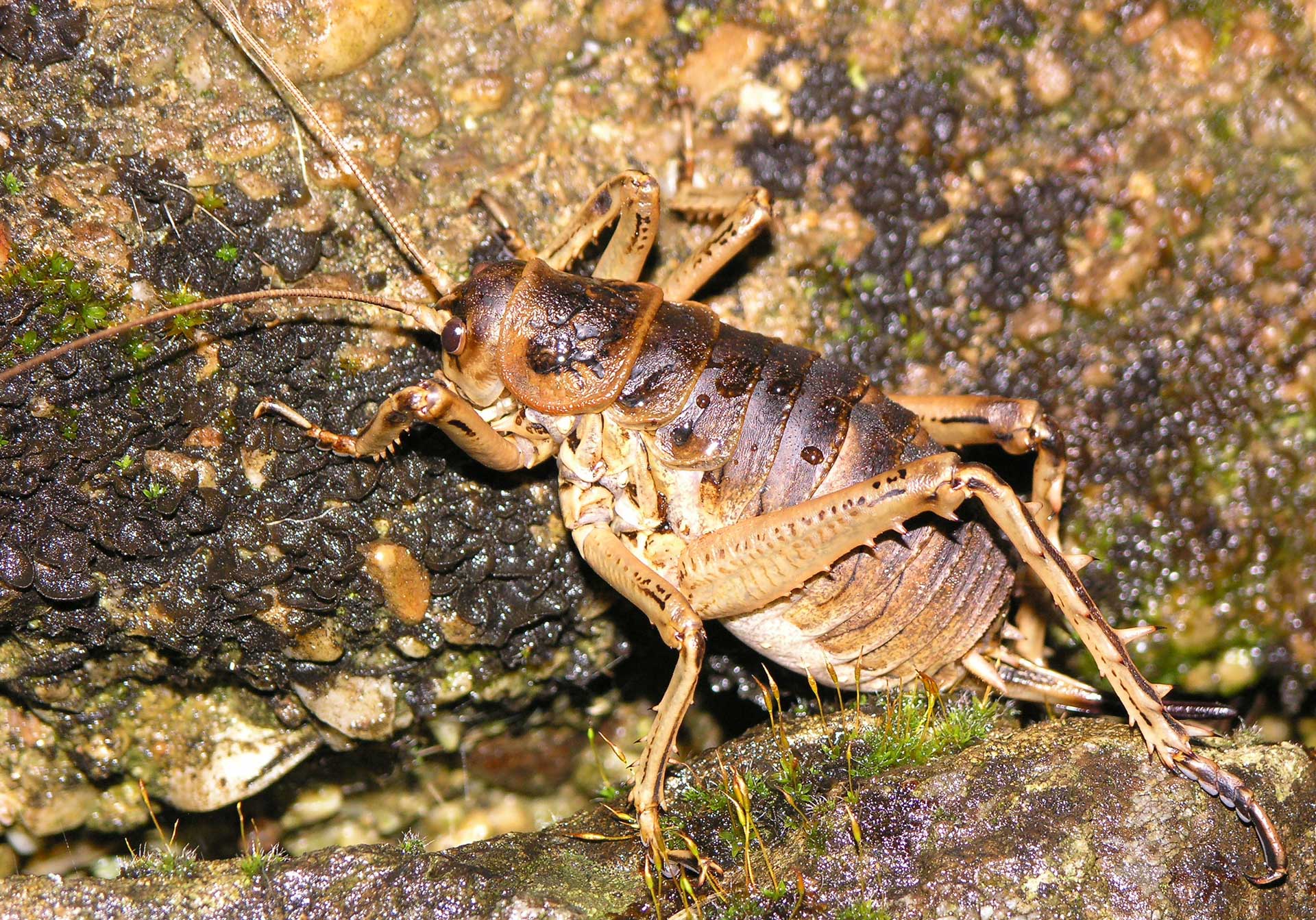 Внешне чем-то похожа на кузнечика. Имеет темно-оливковое, зеленоватое тело округлой формы. Лапы длинные с шипами, имеются длинные усы. Это насекомое эндемик и обитает исключительно на острове Литтл-Барриер Новой Зеландии.