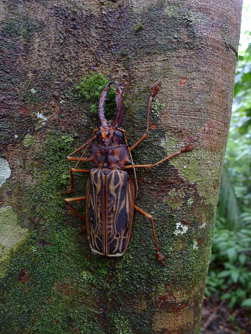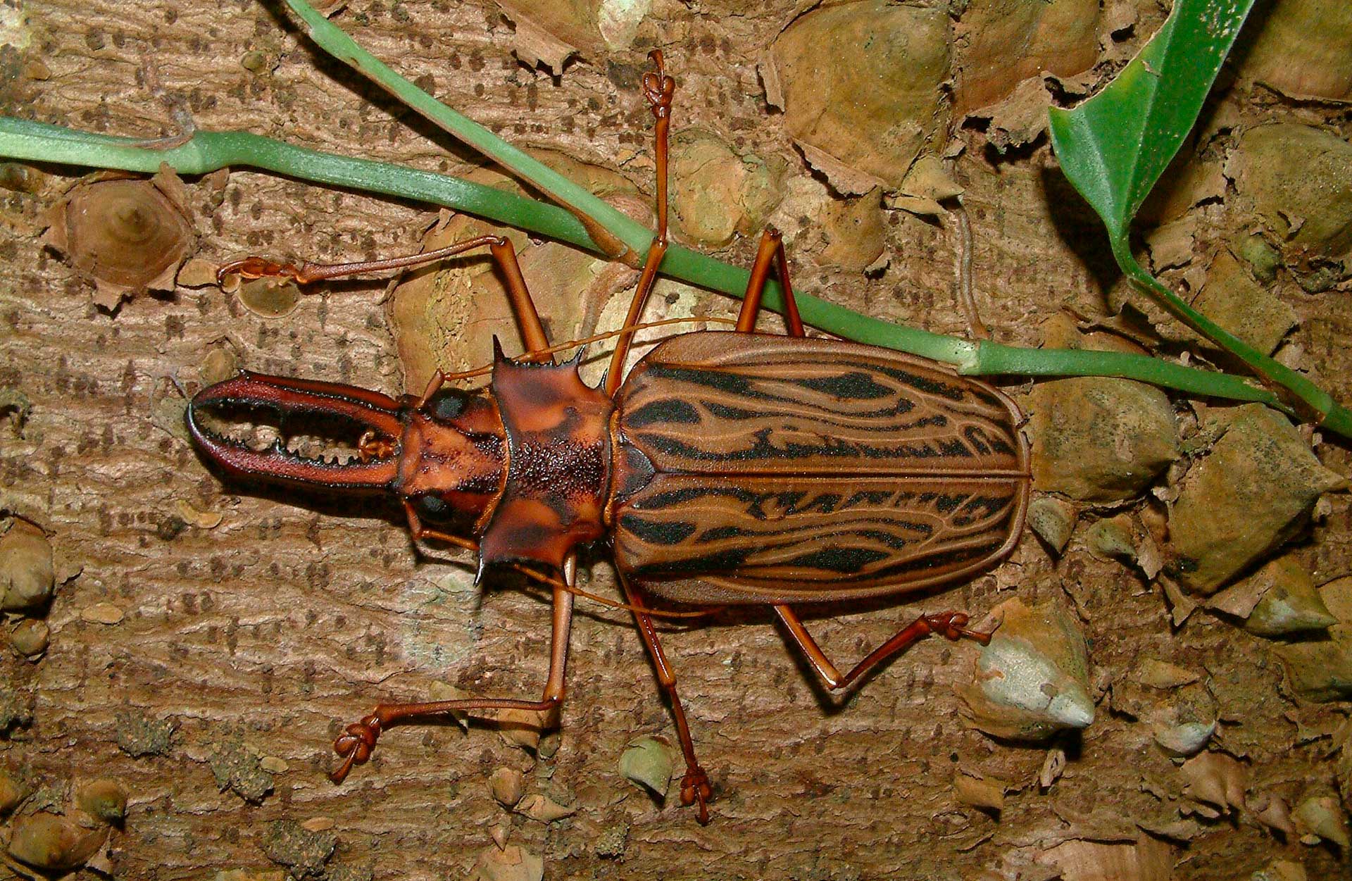 Имеет огромные передние челюсти. У них есть крылья и они могут летать. Распространены эти жуки в тропиках Южной Америке.