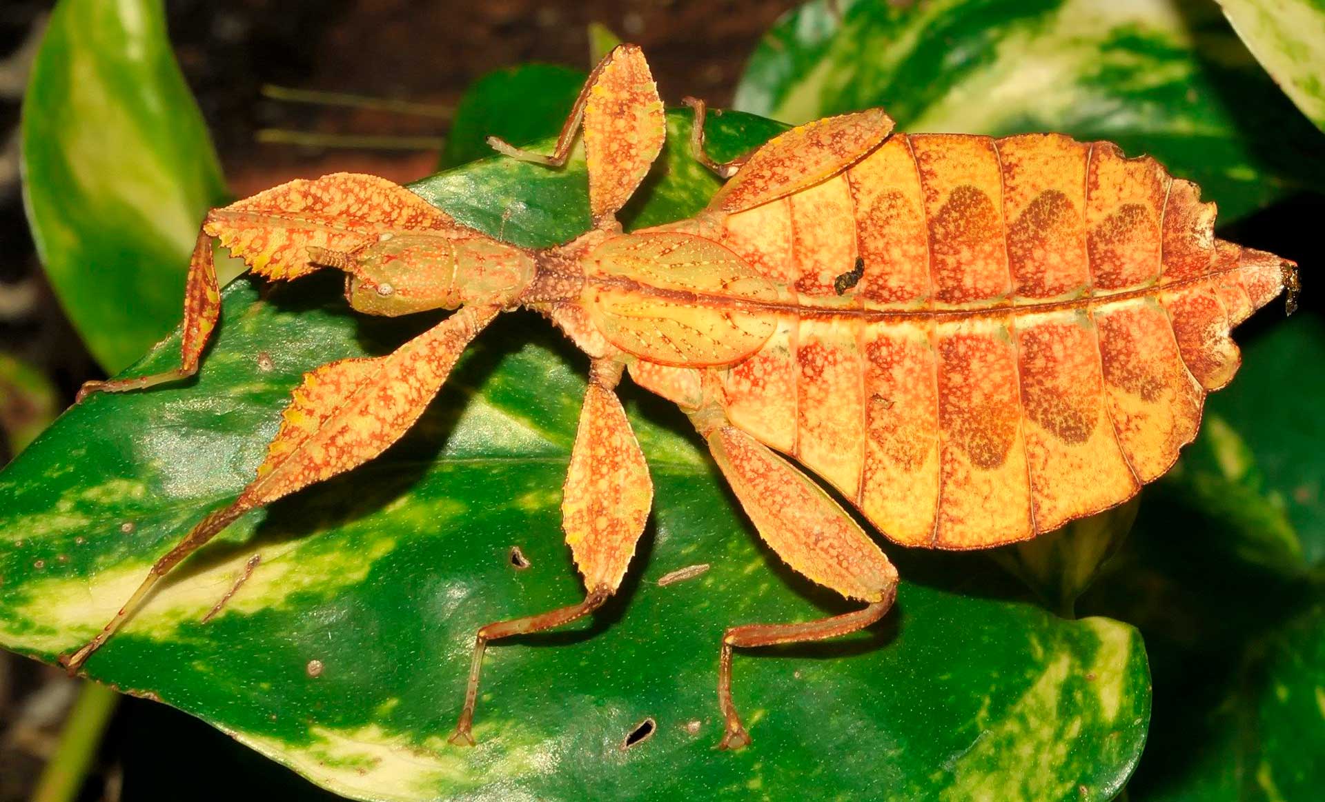 - Листотел – пожалуй, одно из самых необычных видов больших насекомых нашей планеты. Они полностью оправдывают свое название и выглядят как листья дерева, хорошо сливаясь с окружающей средой. Причем на листья больше похожи самки этого вида, а самцы имеют более вытянутое тело. Вырастают длиной до 12.5 см.