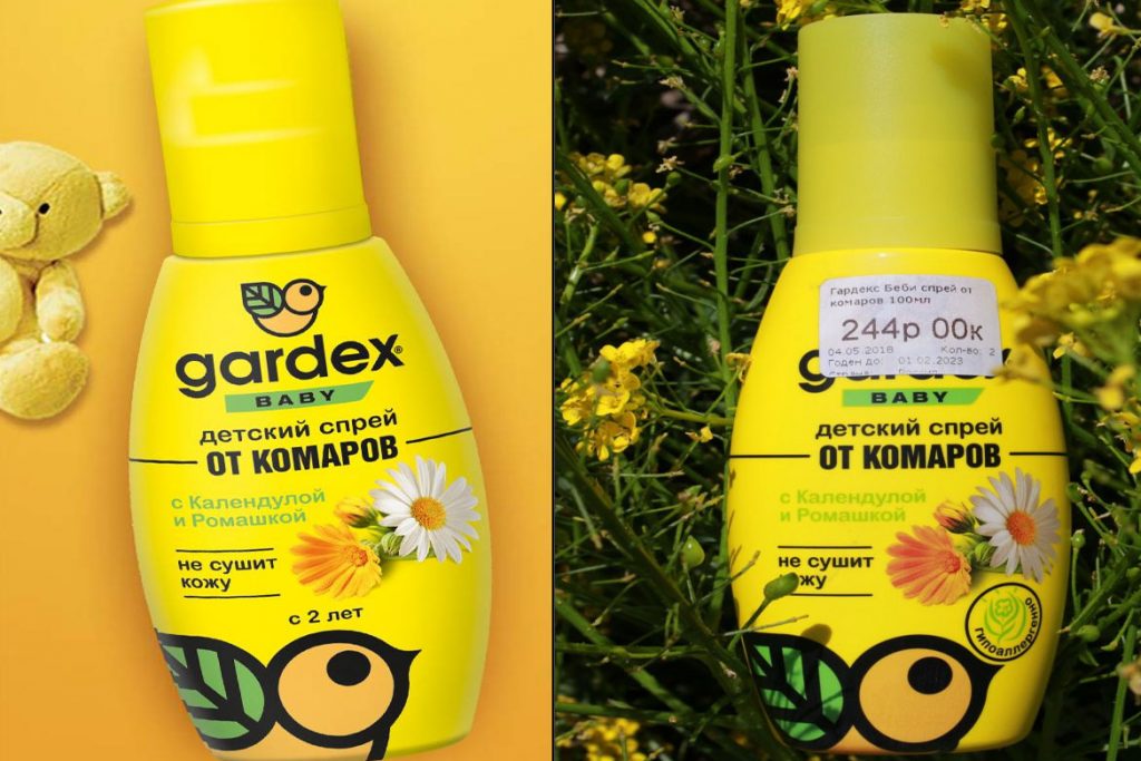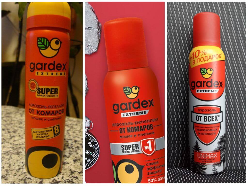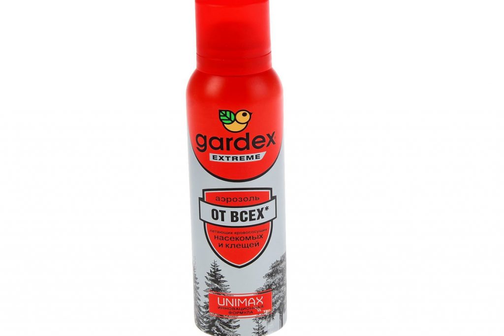 Аэрозоль Gardex Extreme, обеспечивающее защиту человека от летающих насекомых и клещей, – ярко-красный баллончик объемом 100 мл. Предназначен для нанесения на кожу и вещи из натуральных тканей. Срок действия – 5 дн. (от клещей на одежде), 30 дн. (от комаров) и 4 ч – при обработке кожи.