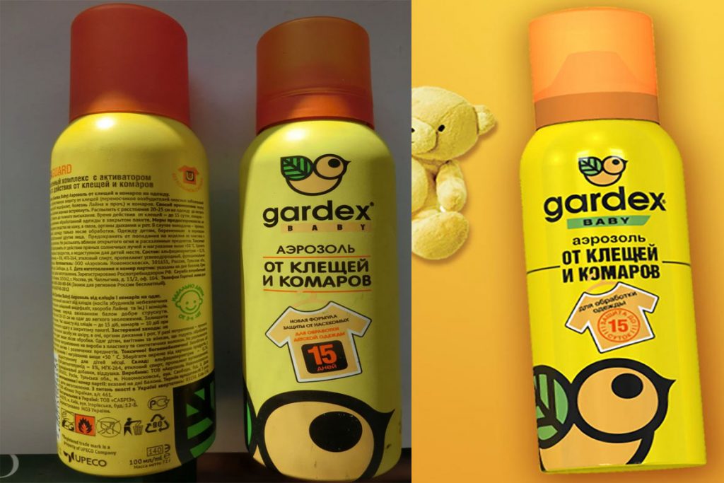 - Акарицидно-репеллентные средства. Наносятся только на одежду, ведь содержат акарициды. В целом и действуют они аналогично акарицидным препаратам. Правда, химический состав этих средств дополнительно усилен репеллентами, отпугивающими клещей. За счёт чего получается двойная защита – обработанная одежда не только оказывает нейтрализующее воздействие на прицепившихся паразитов, но и отпугивает их (включая комаров, мошкару и пр. гнус). В качестве примера подобного средства можно назвать аэрозоль от клещей и комаров на одежду из желтой серии Гардекс Бэби.