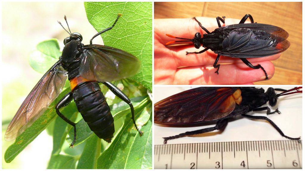 Самая большая муха в мире Gauromydas heros из семейства Mydidae является обитателем лесов Южной Америки. Представляет собой весьма крупное насекомое, длина тела которого достигает 6 см. Имеет это существо и самый больший размах крыльев (до 10-12 см). Основной окрас тела черный (фото большой мухи можно увидеть ниже).