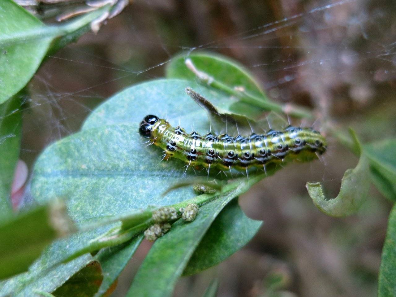 - на самшите можно увидеть зеленых гусениц с черной полоской по бокам, имеющих опушение из небольших волосков;