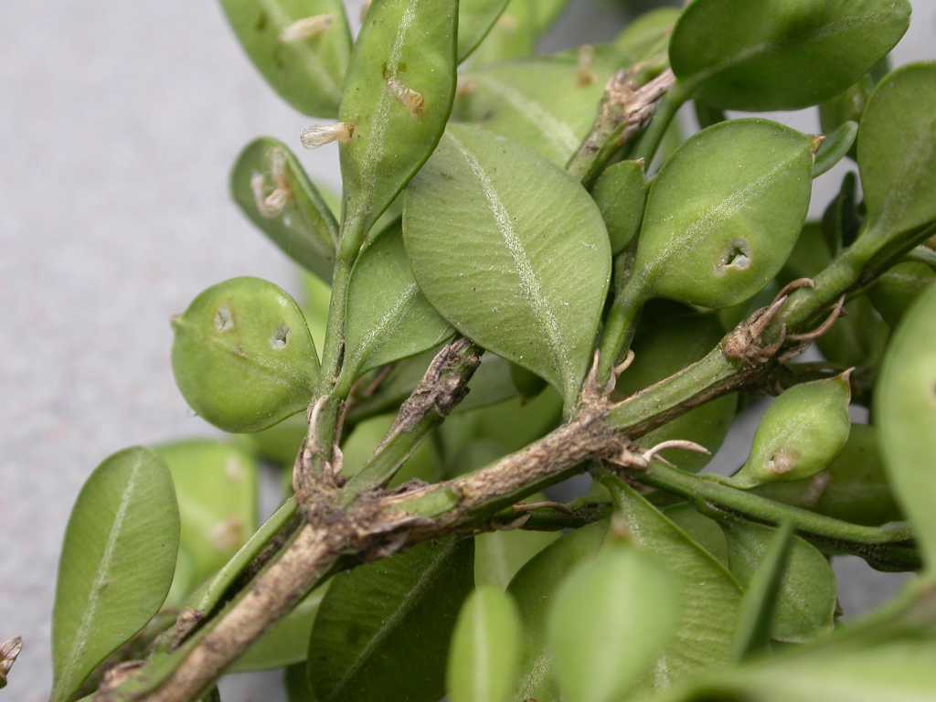 - листья самшита (а позже – побеги и целые кусты) начинают засыхать и погибать.