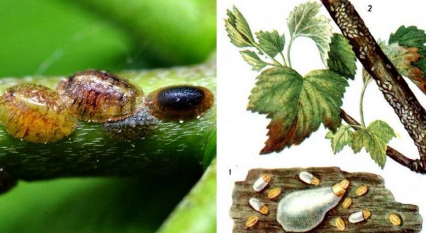 1- личинки и куколки щитовок; 2- щитовка на смородине