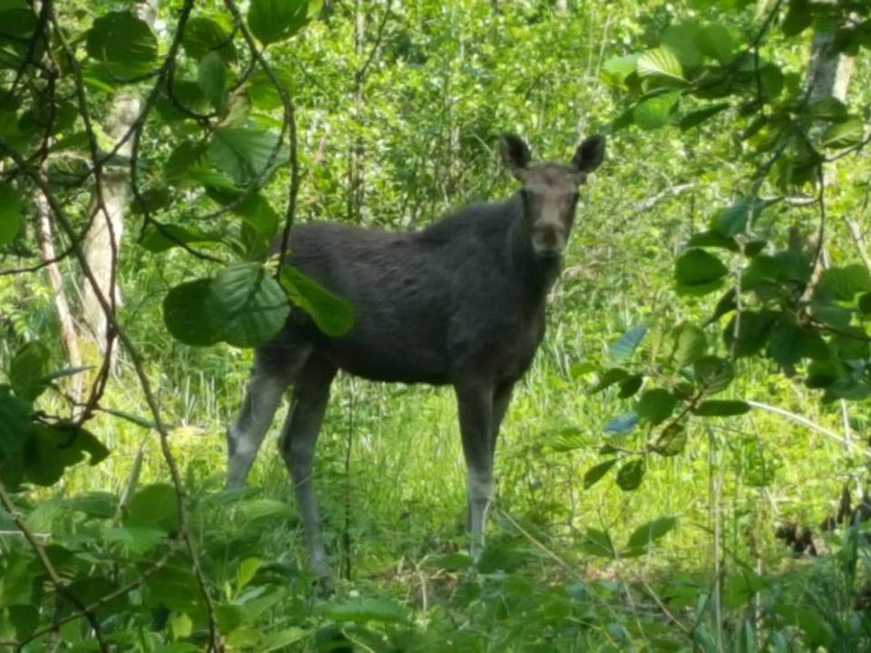 Самый крупный из оленей (длина тела до 3 метров, высота в холке до 2.5 метров). Вес его достигает до 500 кг. Его легко узнать по длинным мощным ногам, горбоносой морде. Рога взрослых самцов обычно состоят из короткого ствола и широкой лопаты с отростками. Окраска буро-черная, ноги светлые, зеркала нет. След лося длиной около 15 см (основные копыта), а вместе с маленькими, но глубокими отпечатками дополнительных копыт – до 30 см.Лежка большая, прямо на снегу. Активен в любое время суток, но чаще всего питается перед рассветом и после заката, а в многолюдных местах по ночам. Держится поодиночке или небольшими группами. Питается листьями деревьев и кустарников, а также травой, грибами и ягодами. Зимой переходит на веточный корм, кору молодых осин и сосен. Гон начинается в конце лета. Отел происходит поздней весной, лосихи приносят 1-2 лосят.На Куршской косе лось является одним из символов, напоминающим о временах королевских охот и заказнике «Эльхенвальд». Регулярные встречи посетителей с этими лесными великанами способствуют росту интереса к национальному парку и его престижу. В настоящее время численность локальной группировки лосей составляет 15 особей.Встречи с этим животным не редкость в заболоченной местности на 37-м километре. Встречаются группы из самцов, самки с детенышами. Лось не редок на участках: 29 – 32 км., и на 5 – 9 км.