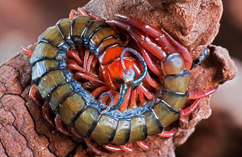 По фото можно понять, что кольчатая сколопендра сильное насекомое, мощными челюстями ее служит первая пара ножек. Она захватывает ими жертву, которая может превышать ее саму по размерам и весу, и цепко удерживает. Благодаря чувствительной паре усиков на ее голове, она легко ориентируется в пространстве, ими она ощупывает себе путь при довольно быстром движении.
