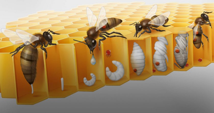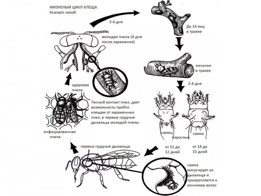 Размножение паразитов происходит в расплоде, поэтому вышедшая из ячейки пчела уже имеет прикрепленных к спине клещей.