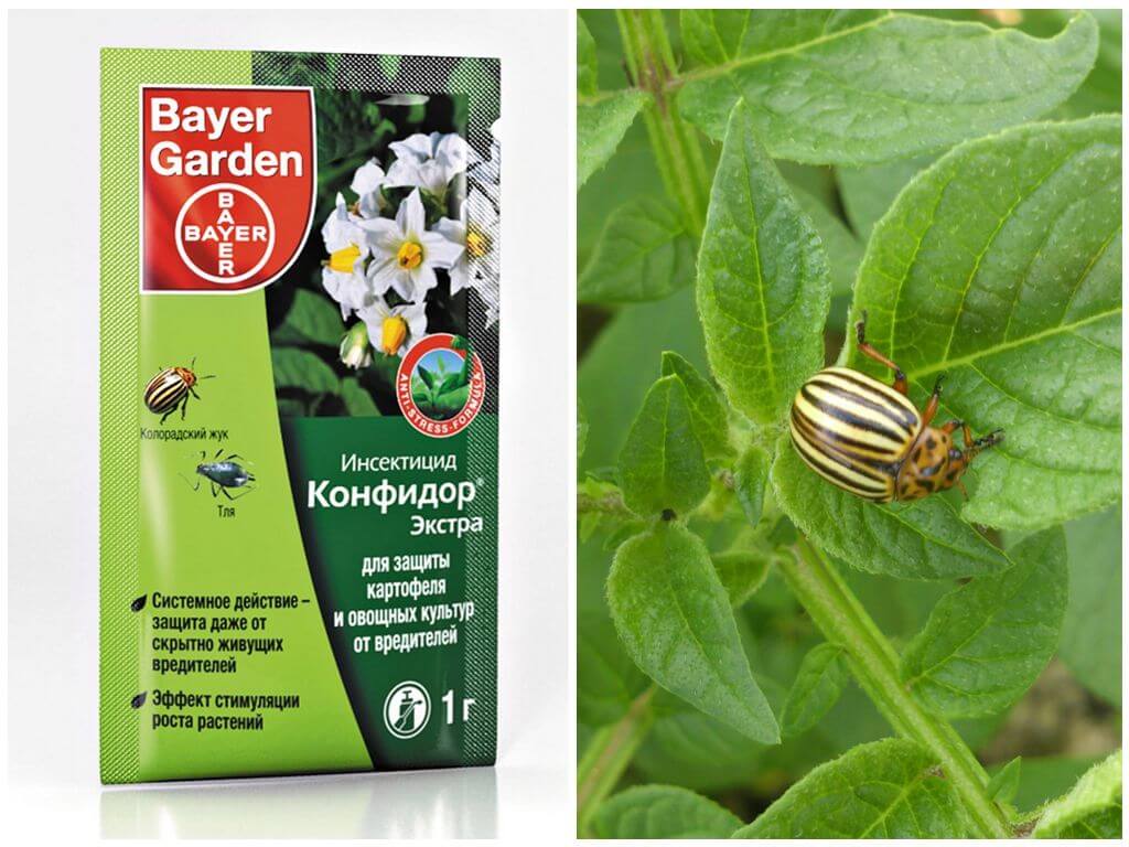 Обработка клубней картофеля осуществляется путем опрыскивания. Средство действует на основе имидаклоприда. Отзывы об эффективности преимущественно положительные. Дополнительно защищает культуру от болезней, нашествия тли, моли, вредительства медведки. Конфидор экономно расходуется, сохраняет свойства до 50 суток. Для приготовления раствора необходимо 1 мл концентрата растворить в 10 л воды, допускается более высокая концентрация с разведением в 5 л жидкости. Купить препарат можно в специализированном магазине, хозяйственных отделах супермаркета, заказывают через интернет. Конфидор выпускает известная компания Байер. За 0,5 л оригинального инсектицида придется заплатить 6300 руб. Пакетик с 1 г средства стоит 27 руб.