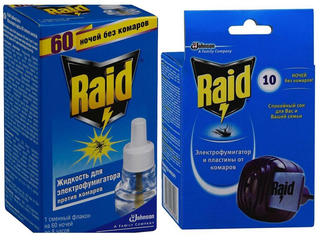 Фумигатор Raid Активные вещества выделяются в воздух при нагревании фумигатора. Жидкость Рейд от комаров выделяет праллетрин в воздух дозировано, запасов хватает на 60 ночей. Пластины меняют каждую ночь. Токсическое вещество относится к группе умеренно опасных средств, при правильном использовании не влияет на самочувствие человека.