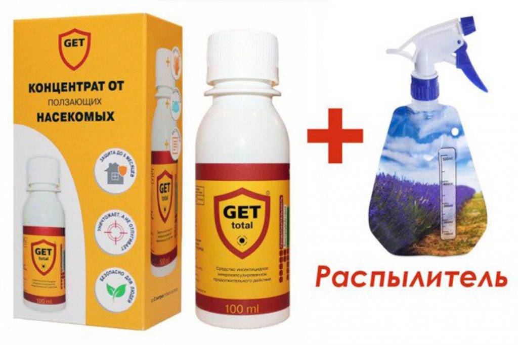 Особенность Get заключается в том, что активное вещество в нем заключено в микроскопические липидные капсулы. Это делает его безопасным, увеличивая срок хранения до полугода. Если хранить препарат в помещениях с повышенной влажностью, срок годности сокращается до 3-4 месяцев. В его составе имеются: отдушка, обладающая тонким ароматом апельсина и спирты. В продажу Get Total поступает в бутылочке белого цвета емкостью 100 мл.