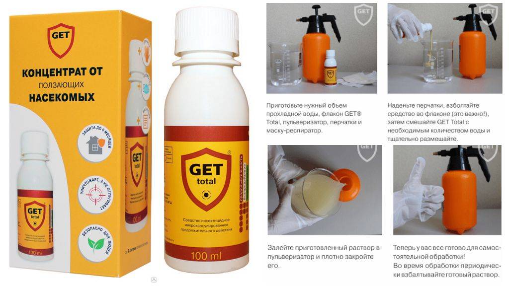 До начала обработки следует изготовить рабочий раствор средства. Он эффективен в течение 8 часов с момента приготовления. В инструкции к «Get» подробно указано, как следует разводить концентрированную жидкость. Если речь идет о травле тараканов, то готовят рабочий раствор исходя из соотношения 1:10, или 100 г средства на литр воды.