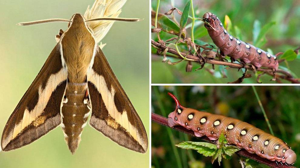 - гусеницы питаются молодыми листьями. Винный бражник поедает зелень, селится на виноградной лозе. Личинка крупная, воинственной окраски, на конце находится своеобразный шип. Существо настолько необычное, что многие хозяева не уничтожают вредителей, а наблюдают за ними, в надежде перетерпеть неприятный период, позже увидеть на участке красивую бабочку-колибри;
