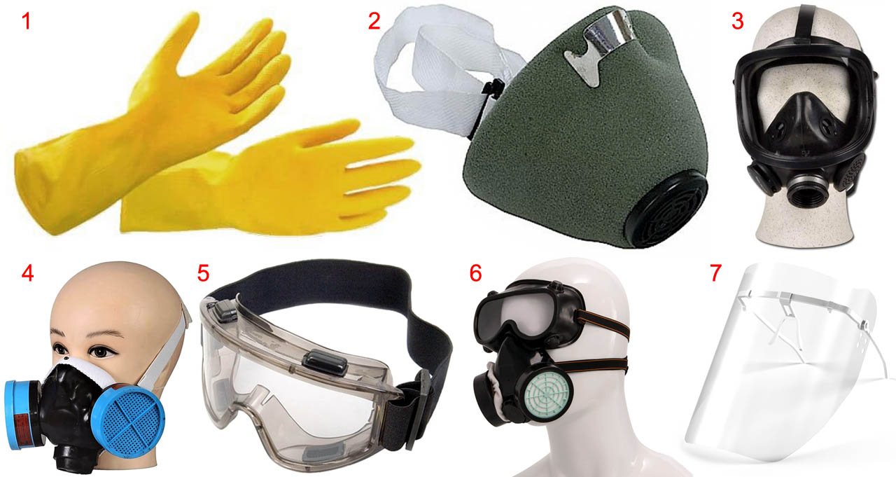 Латексные перчатки на руки не годятся, нужны защитные для ядохимии. Подойдут самые легкие (и дешевые) однослойные, поз. 1 на рис. Если раскошелитесь на 2-3 слойные перчатки, хуже оттого никак не будет.