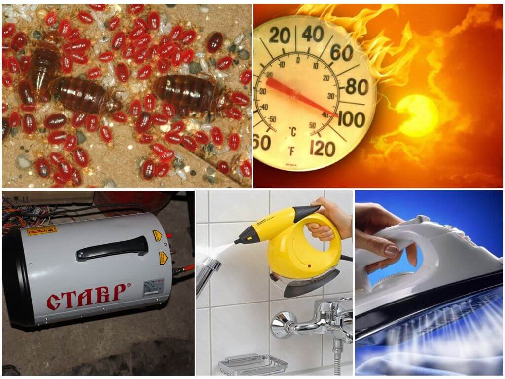 Горячий стоградусный пар против кровососов более эффективен, нежели классическое прогревание воздуха в квартире. Если использовать эту методику, то они умирают мгновенно. Борьба с вредителями при помощи «горячего тумана» (нагрев воды не выше +40 градусов) быстрого результата не дает.