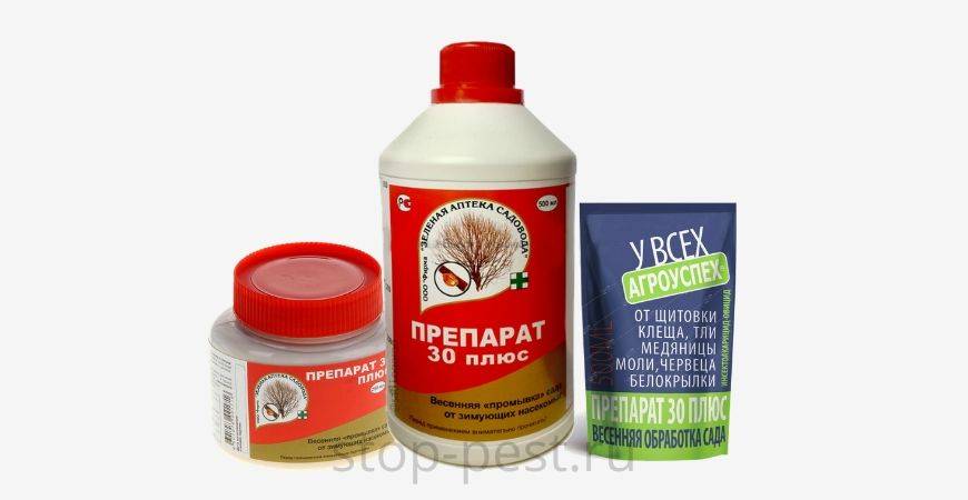 1. «Препарат 30 Плюс»(минерально-масляная эмульсия) | 500мл/ 10 л. воды | косточковые, семечковые, декоративные культуры, а также виноград | зимующие стадии вредителей щитовок, ложнощитовок, тлей, бабочек (гусениц), медяницы, молей, червецов, а также клещей (почковых, войлочных, паутинных и пр.) и др. |