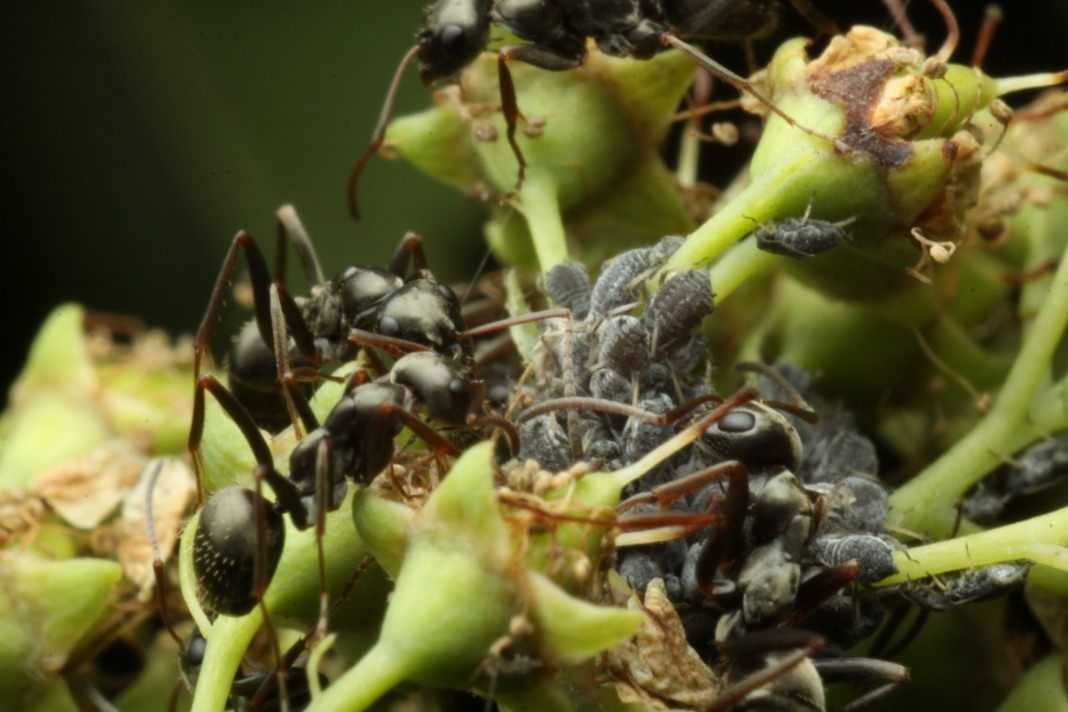 При появлении возле растений ползающих муравьёв, нужно обязательно проверить, не заражены ли кусты тлёй. Обычно их привлекает выделяемая тлёй медвяная роса. Кроме этого, тля находится под защитой муравьёв, получая взамен сахаросодержащие выделения.