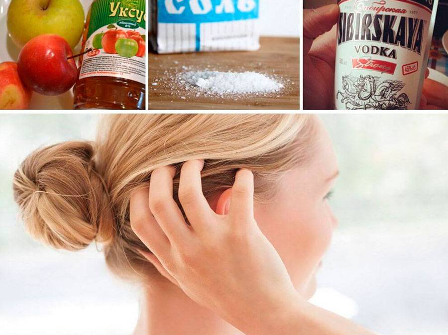 Чтобы приготовить состав, необходимо взять 250 миллилитров уксусной воды, добавить туда 30-40 грамм поваренной соли и 5-10 миллилитров спирта или водки. Все перемешать и наносить на волосы 3-4 дня подряд.