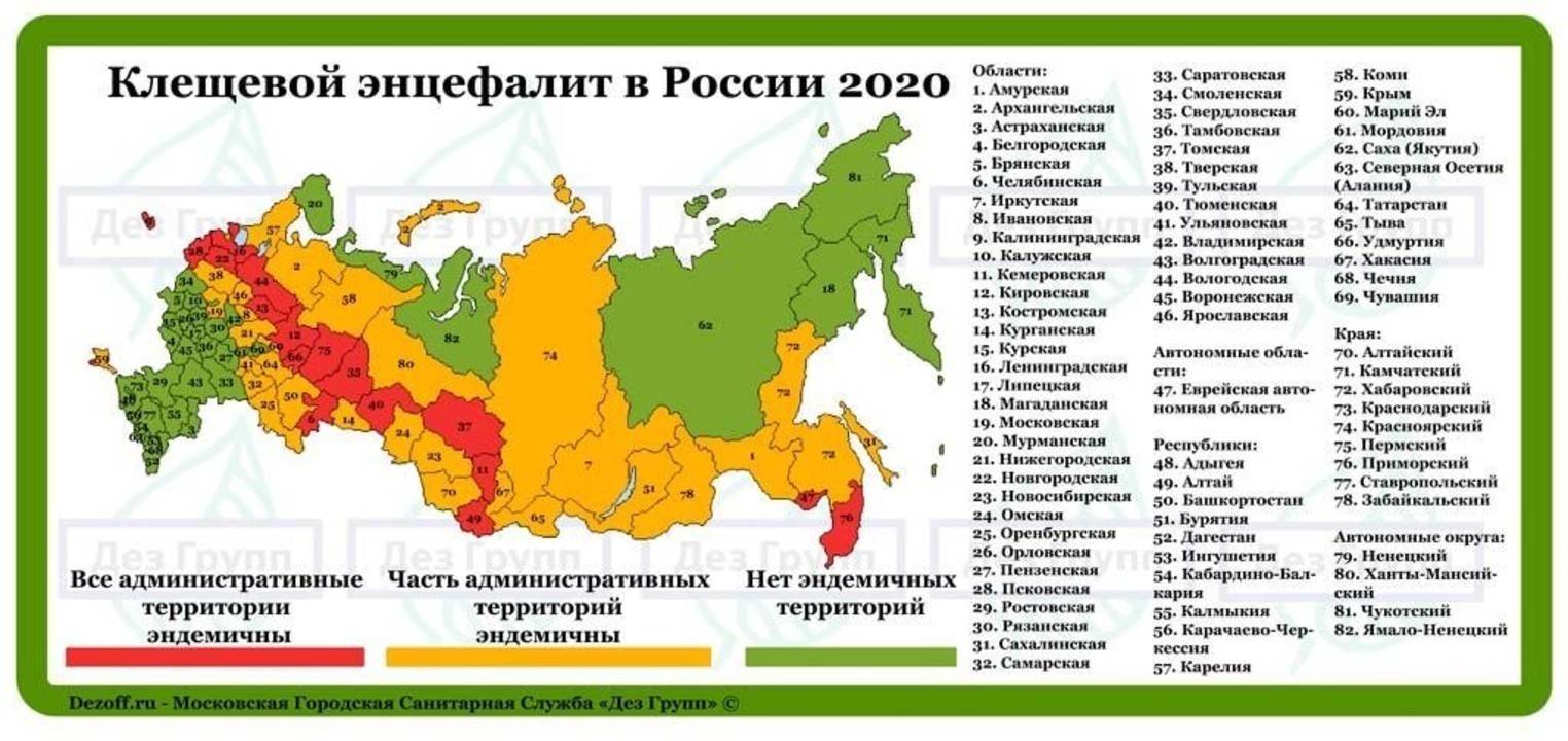 Рисунок 2. Регионы России, эндемичные по клещевому энцефалиту в 2020 году. Источник