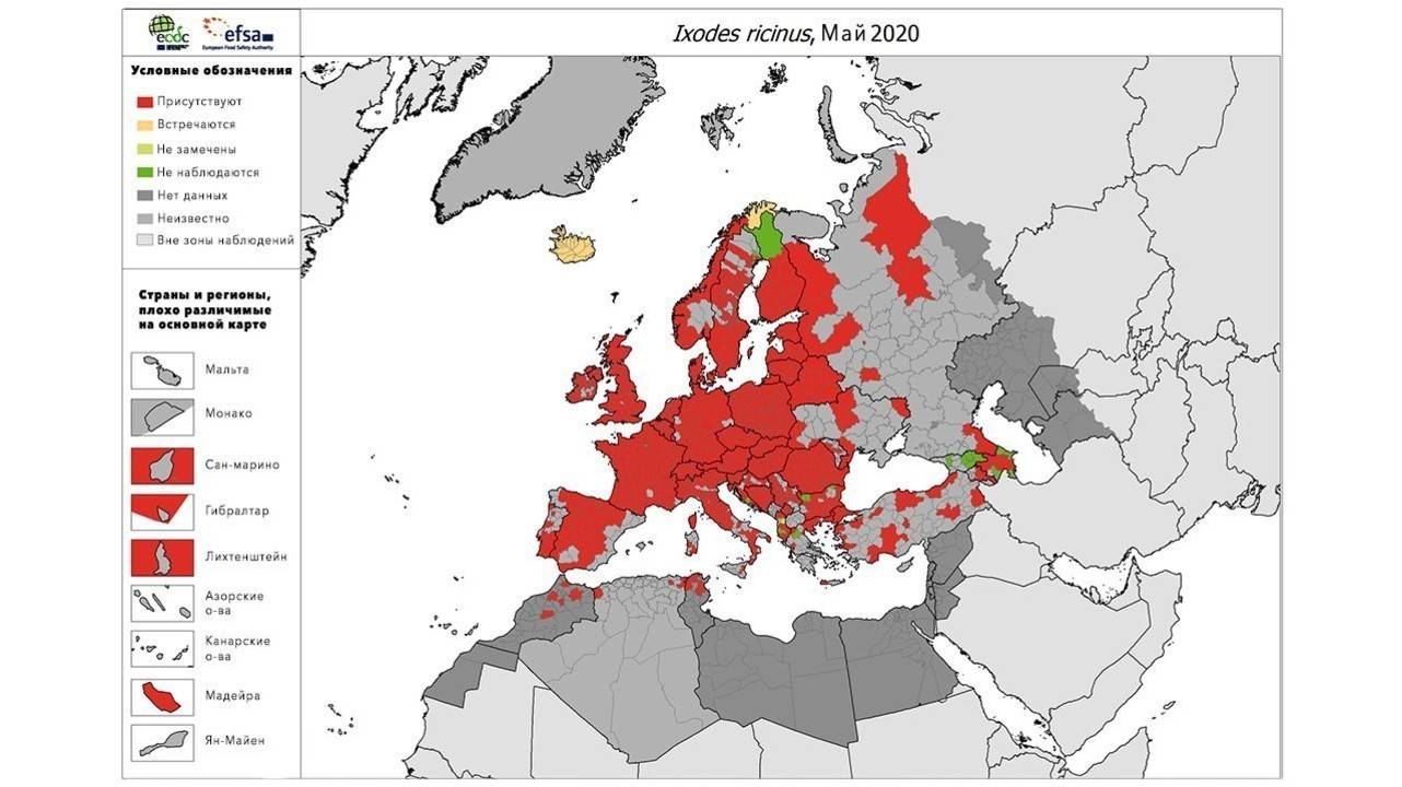Рисунок 1. Распространение клещей Ixodes ricinus – переносчиков клещевого энцефалита в Европе в мае 2020 года. Источник