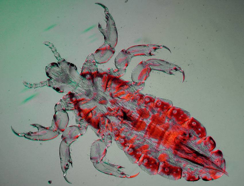 При укусе вошь впрыскивает в ранку слюну, содержащую обезболивающие вещества, благодаря чему сам укус достаточно безболезнен и может вызывать только ощущение несильного покалывания. Ниже представлено еще несколько фотографий, на которых видно, как кусают бельевые вши:
