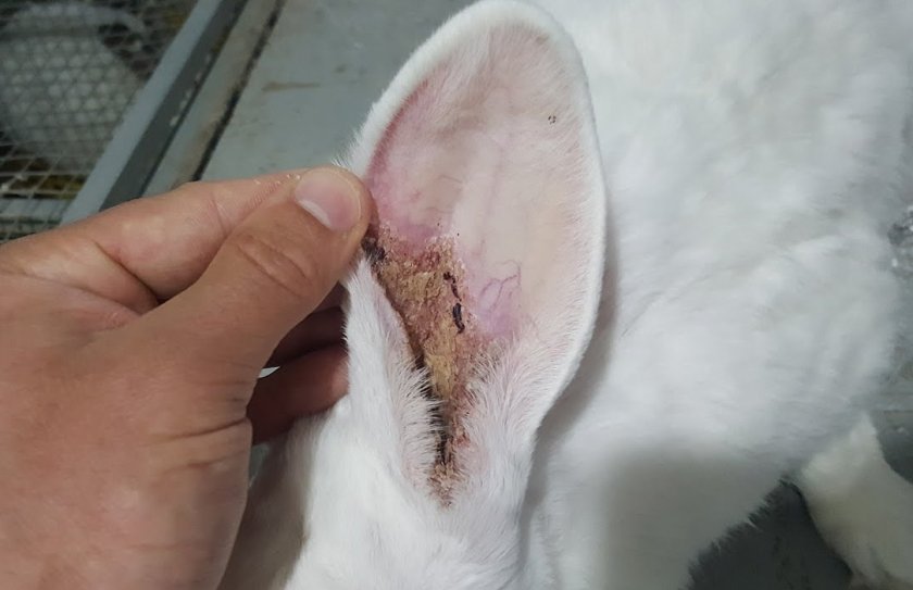 Выраженный псороптоз обнаруживается и визуально. Уши кролика в пораженных местах опухают, покрываются струпьями и язвами, становятся горячее основной массы тела.