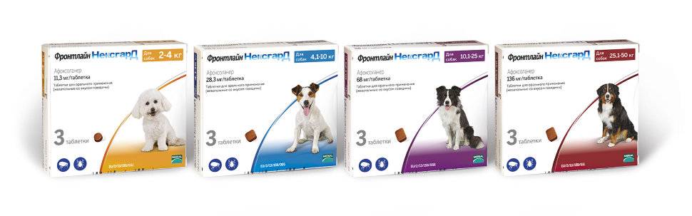 Преимуществом перорального приема несколько. Во-первых, не нужно следить, чтобы любимец не слизал нанесенный препарат, во-вторых, отсутствие наружной обработки не ограничивает тактильное общение между хозяином и питомцем. Назначают Комфортис, Фронтлайн НексгарД, Бравекто для собак.