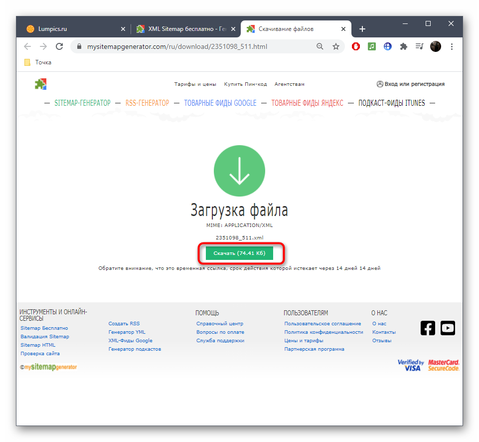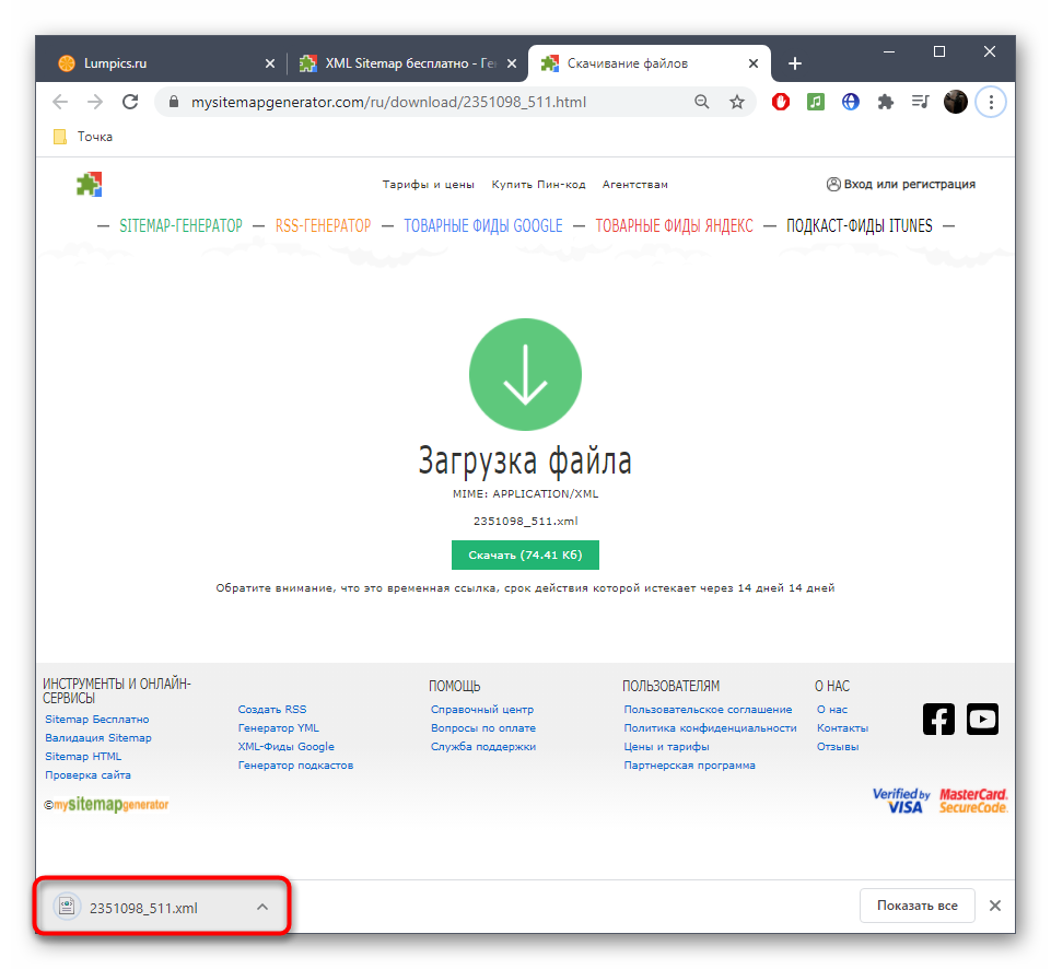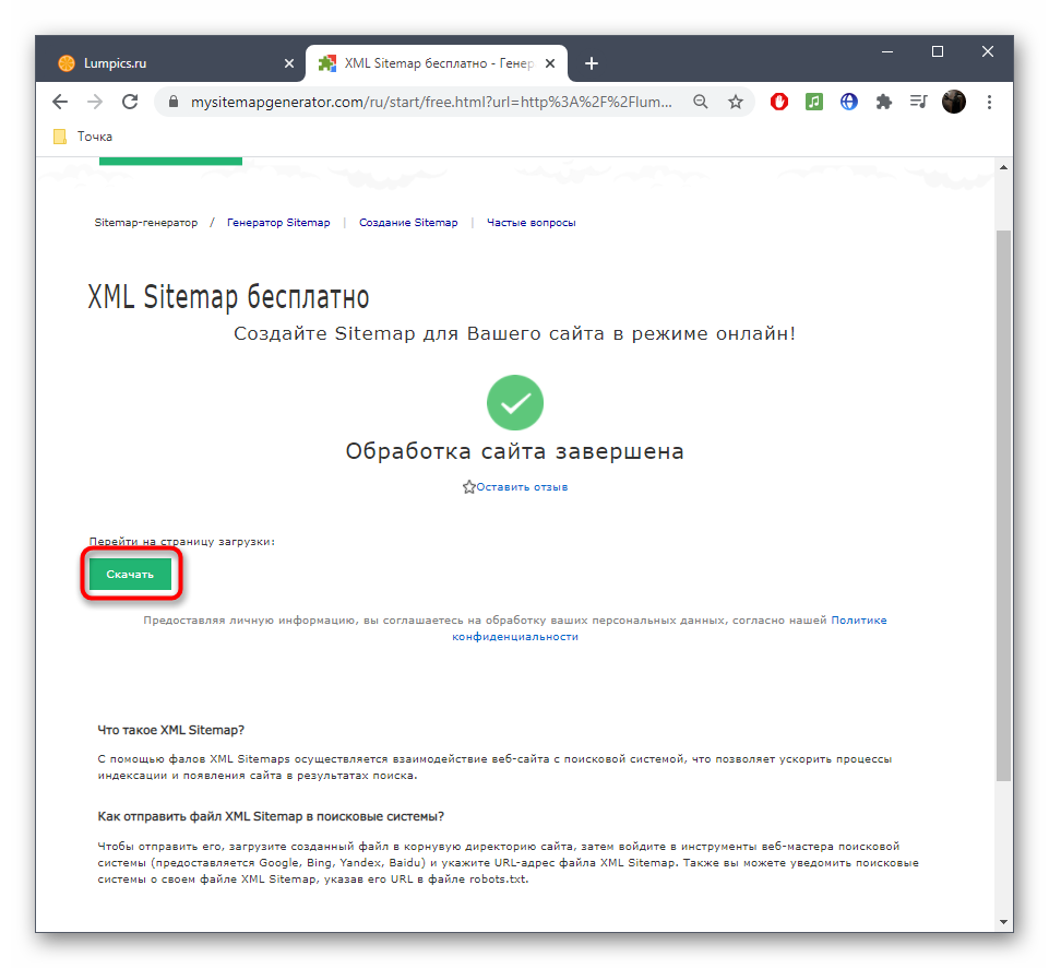 - После окончания процесса нажимаем кнопку «Download your XML Sitemap file» и скачиваем в удобную директорию на компьютер.