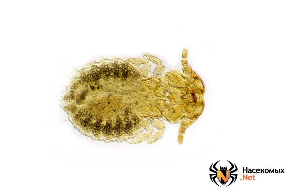 Вши у кошек выглядят как очень мелкие, вытянутые в длину, но достаточно плотные насекомые с крупной головой треугольной формы. На фото представлен власоед под микроскопом — у него хорошо заметна глубокая выемка на передней части головы, которая идеально подходит для захвата волосины и откусывания её: