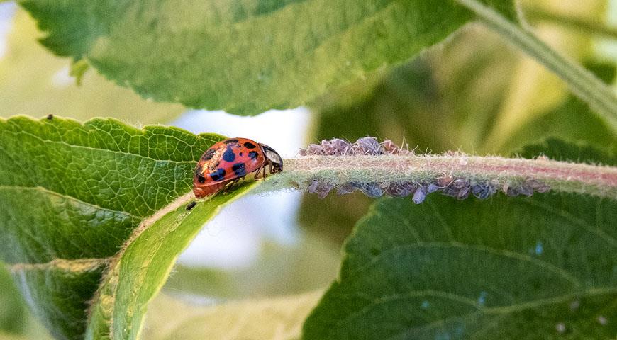 Взрослые особи божьих коровок, а также их личинки питаются вредителями, в том числе тлей. Поэтому, если на участке живут эти насекомые, не нужно от них избавляться. Пятнистая хищная божья коровка съедает до 80 штук тлей ежедневно. Ее личинки такие же прожорливые, как и взрослые особи. Этот жук начинает охоту на тлей с весны, не давая им возможности расплодиться.