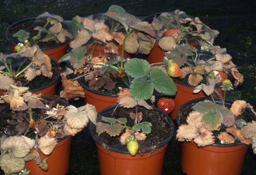 Прозрачный клещ (Polyphagotarsonemus latus)- встречающийся во влажном грунте, он становится активным примерно в середине марта, когда температура на градуснике достигает отметок +13°С. Перекидываясь по земляничным кустам, он забирает все соки из листьев.