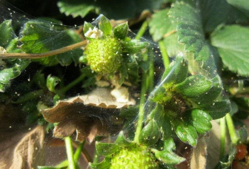 Клещи, поражающие плантации садовой земляники, микроскопичны, поверхность их туловища покрыта редкими щетинками. Обустраивая свою среду обитания, они обвивают листья и стебли паутиной. Сложно конкретно указать окраску вредителей — она непостоянна и зависит от условий существования.