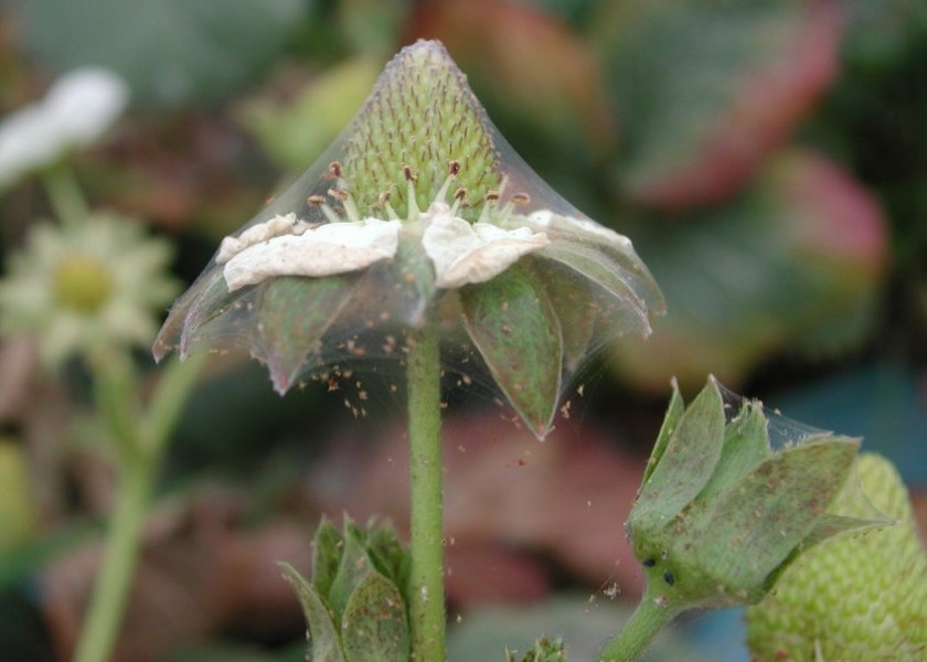 Это вредитель, которого нельзя увидеть невооруженным глазом, поэтому обнаружить его присутствие на клубнике очень сложно. Личинки и взрослые особи питаются листьями, цветами и земляничными почками.В сентябре и октябре появляются зимующие самки, которые постепенно переходят к зимовке.