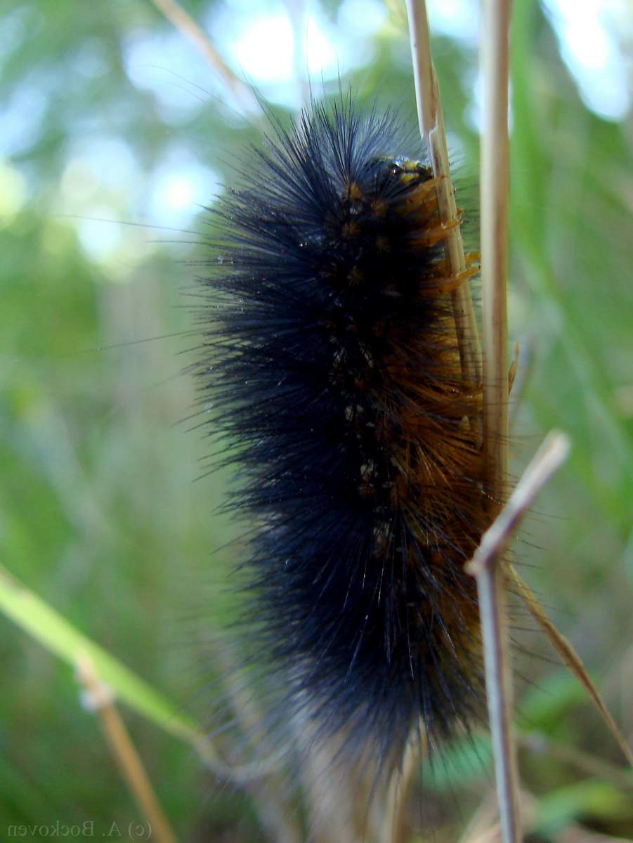 - Гусеница медведицы. Имеет черно-желтую окраску и с пучками волосков.