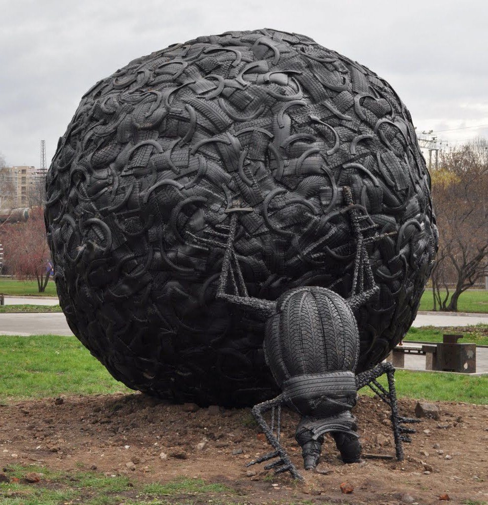 Вот такой вот своеобразный памятник жуку скарабею появился в одном из городов России. Намек на то, что пора освободить землю от «каки» которую люди оставляют после себя. В частности — резиновые покрышки.